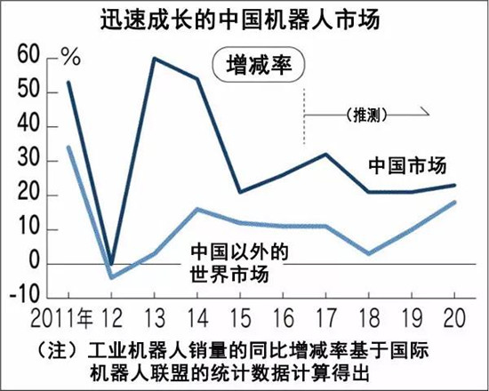 據(jù)國際機(jī)器人聯(lián)盟預(yù)測,到2020年全球工業(yè)機(jī)器人的銷量將比2016年大幅增長77%。其中,中國的銷量有望猛增至2.4倍。在中國,由于人工費(fèi)上漲和獨(dú)生子女政策導(dǎo)致的少子老齡化趨勢,制造業(yè)一線的人手短缺情況突出。此外中國政府提出強(qiáng)化制造業(yè)的方針也促使企業(yè)加速引進(jìn)工業(yè)機(jī)器人。